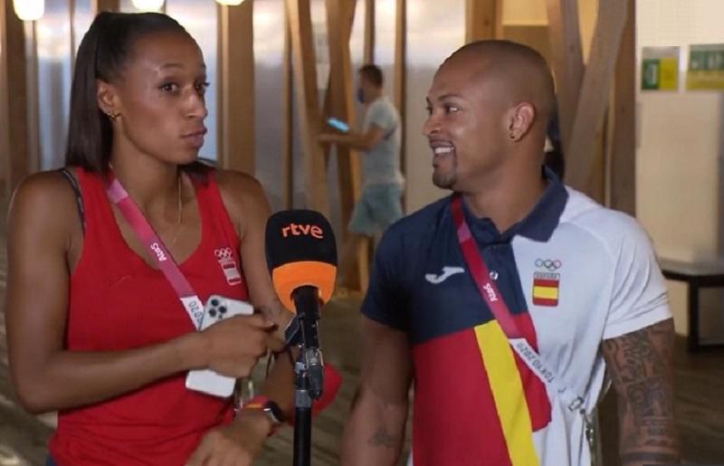 Ana Peleteiro (bronze in triple jump) and Ray Zapata (silver in men's floor gymnastics) are interviewed on television (photo: Screenshot from Spain's national broadcasting company, RTVE)