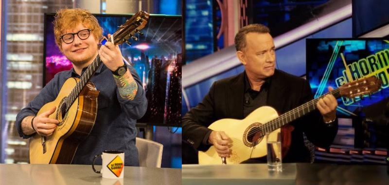 Gata de Gorgos-based bespoke stringed instrument-makers Guitarras Francisco Bros have a long list of famous clients - including Ed Sheeran (left) and Tom Hanks (right), as shown on their website strumming their tailor-made guitars from Spain